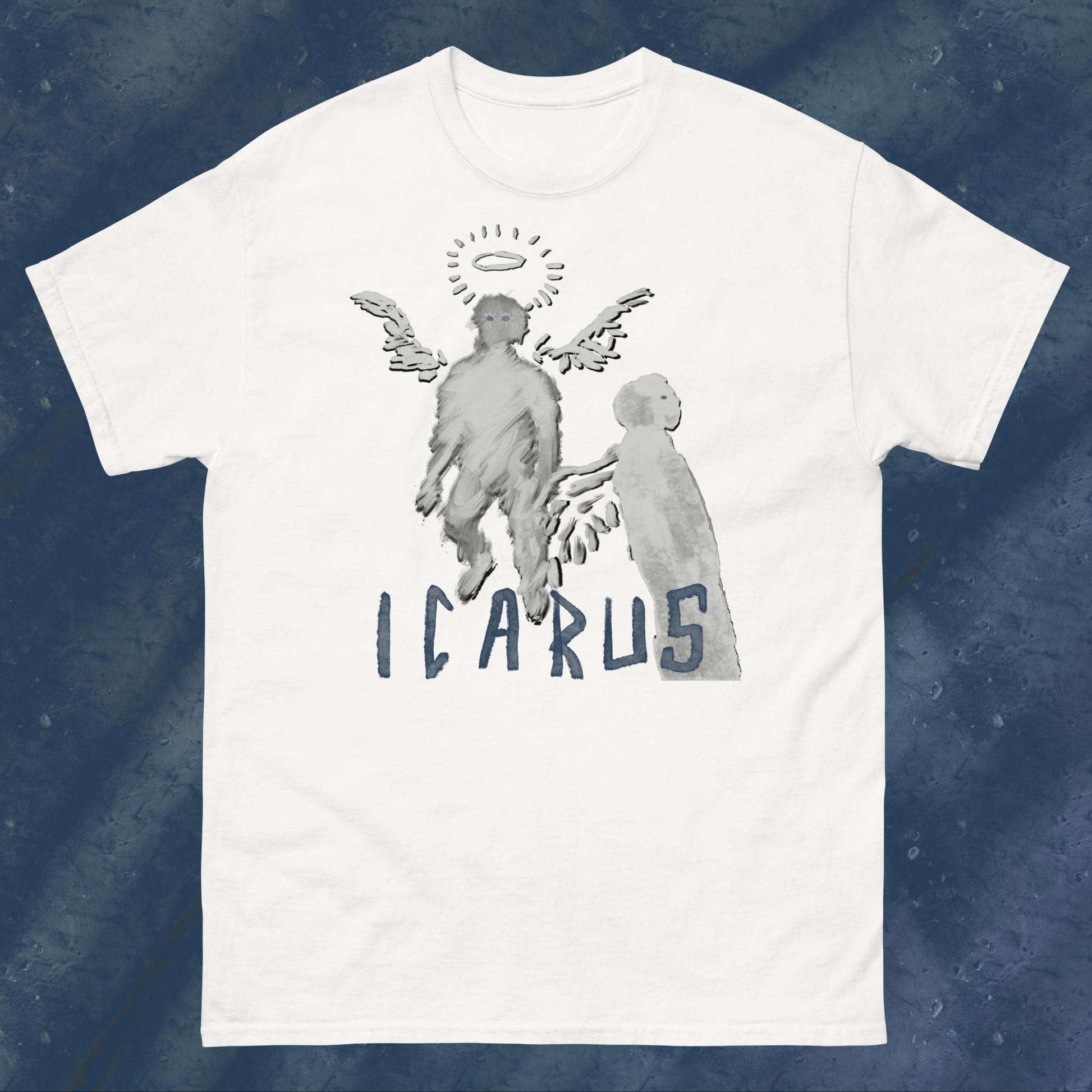 THE LOST IN THE FOREST 'ICARUS TEE' FEATURES THE SILHOUETTE ANGELS OF JAKE AND LUCAS. THE DESIGN IS PRINTED ON A WHITE UNISEX T-SHIRT 100% RING SPUN COTTON.